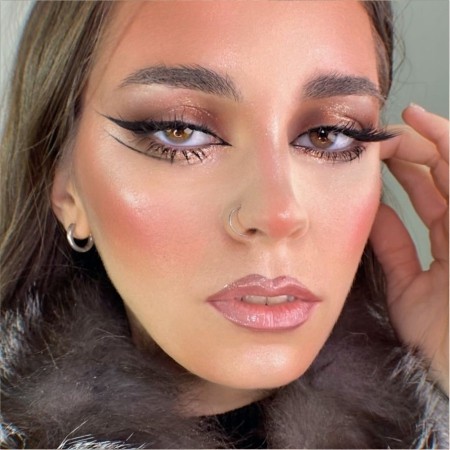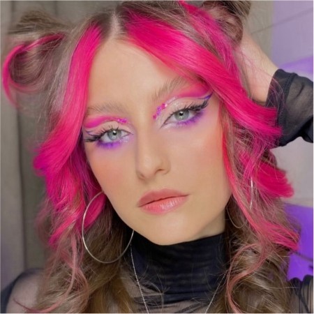 используется сложная техника, работа с рассыпчатыми пигментами, цветовые переходы, сложная графика, накладные элементы, ленточные или пучковые ресницы. Сюда можно отнести технику рисованного грима или стилистических вариантов макияжа